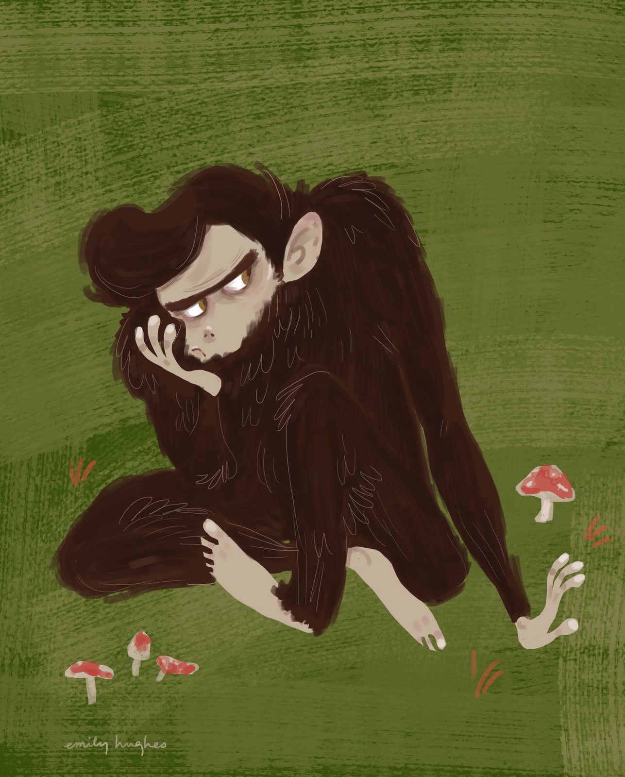 This is a smallpaw I drew one night. This was done more for character design purposes for an internship portfolio, rather than for the actual finished story itself. It was also nice to get a finalized and more detailed study of the smallpaw, since I've mainly been focusing on scribbly little ones more fitting for my narrative. There are a few things I was generally unhappy about in this finish in relation to the book's protagonist. I thought this rendition looked a bit 'chimp-y', rather than hairy human creature. I also thought he looked a bit more bulky than I intended. I am happy with the color scheme and his 'bored of this forest' attitude going on, though, ha.